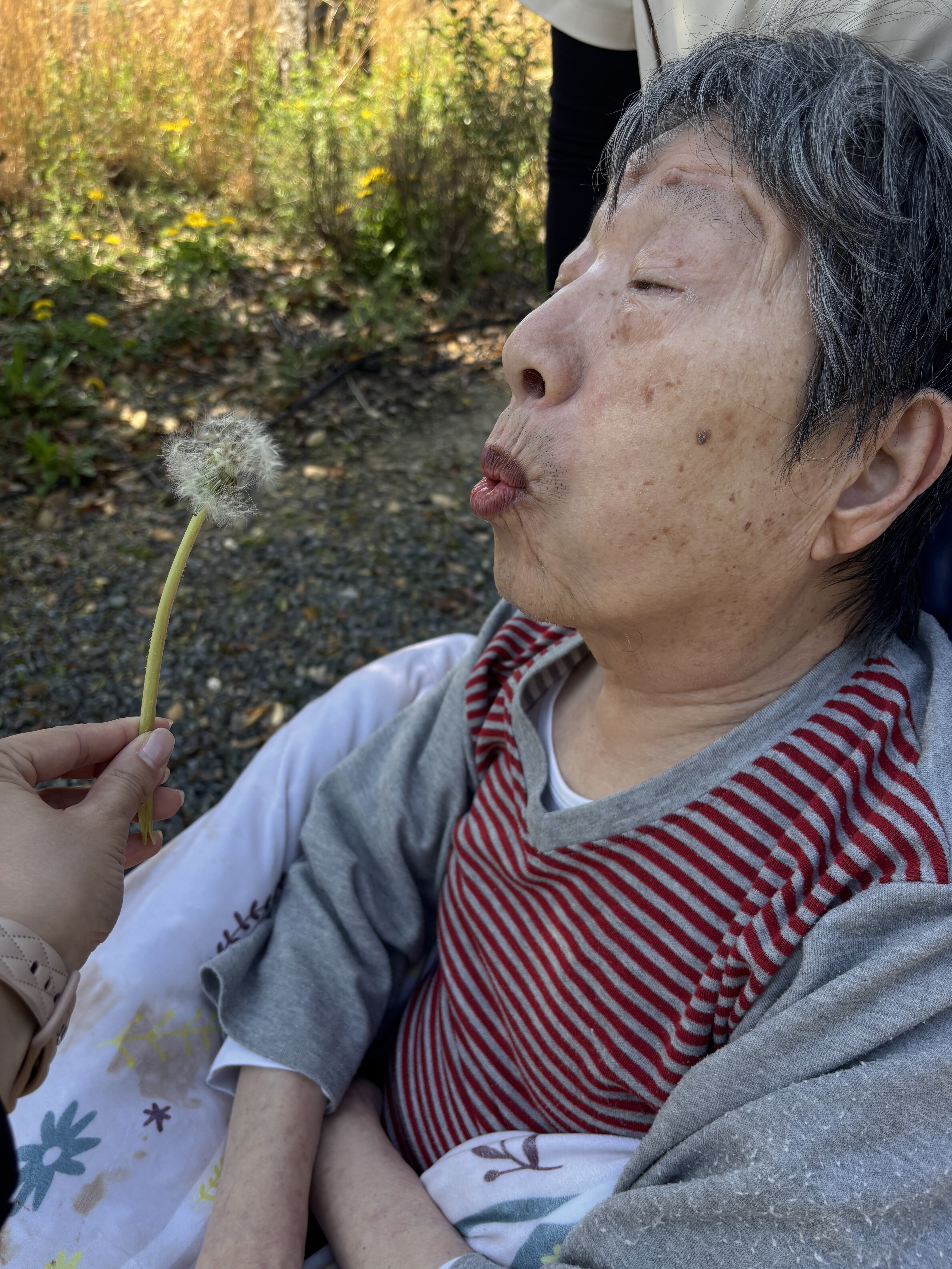 ご入居者様と一緒に「せーの!」で息を吹きかけると、ふわふわと自由に空へ舞い上がっていく綿毛たち。