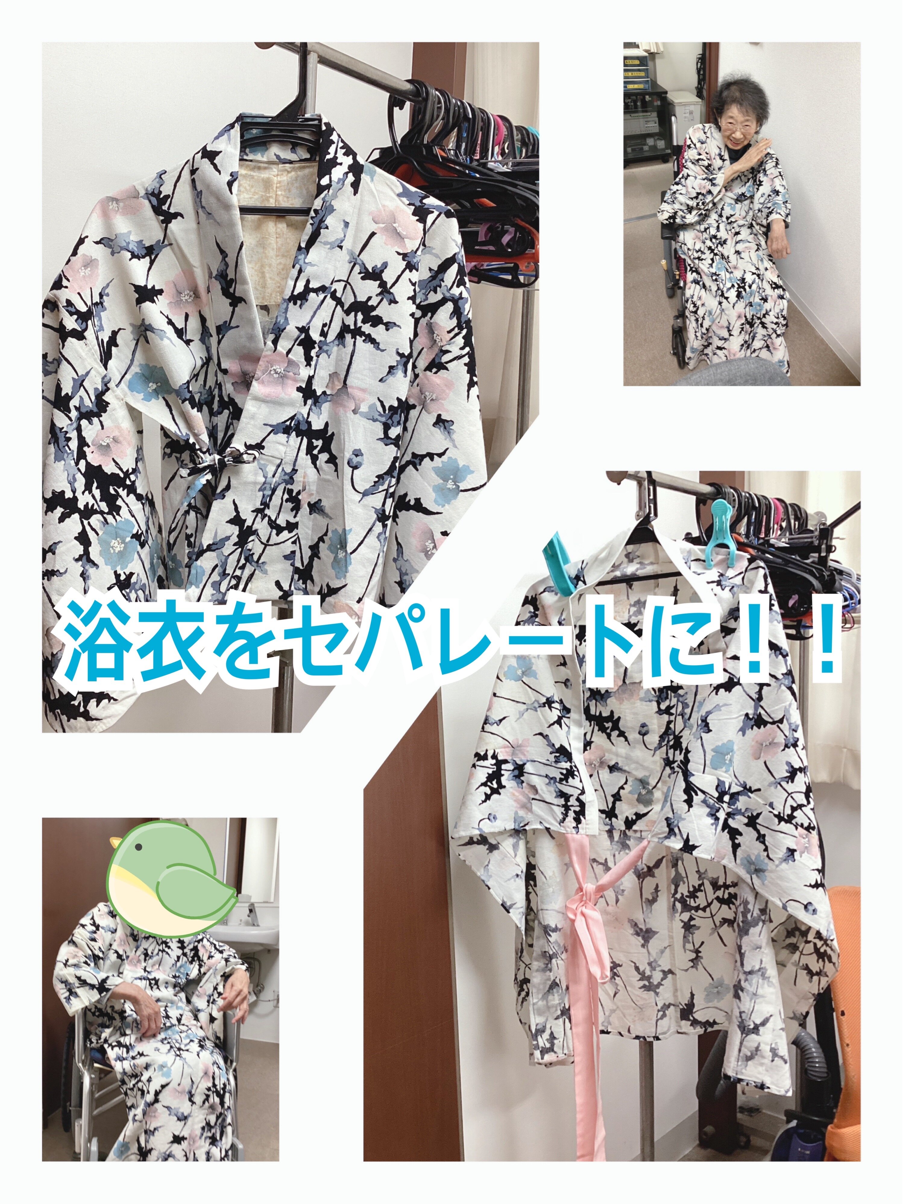 車椅子の方でも浴衣を着やすいようにと裁縫の得意な職員がセパレートにリメイクしてくださいました!(写真は恥ずかしいとのことでご入居者に来ていただいた様子です。)