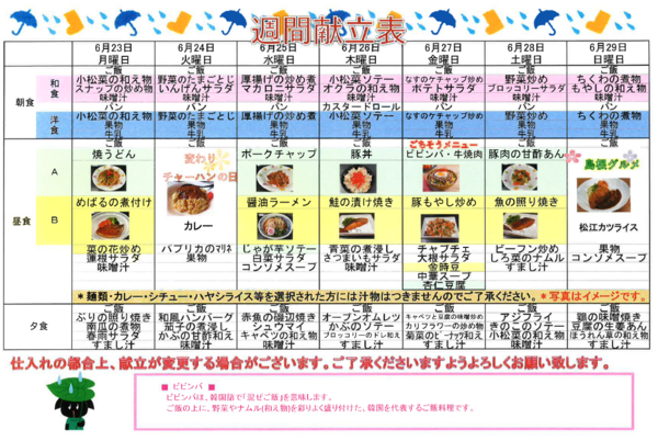 前半は、ほうとう風うどんや、プルコギ、ジャージャー麺、ごちそうメニューも2回ございます。