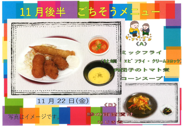 今週は、ごちそうメニューのミックスフライや、お赤飯、ジャージャー麵や