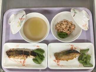 鮭のムニエルです。左上:ミキサー 右上:刻み 左下:一口 右下:常食 となります。
