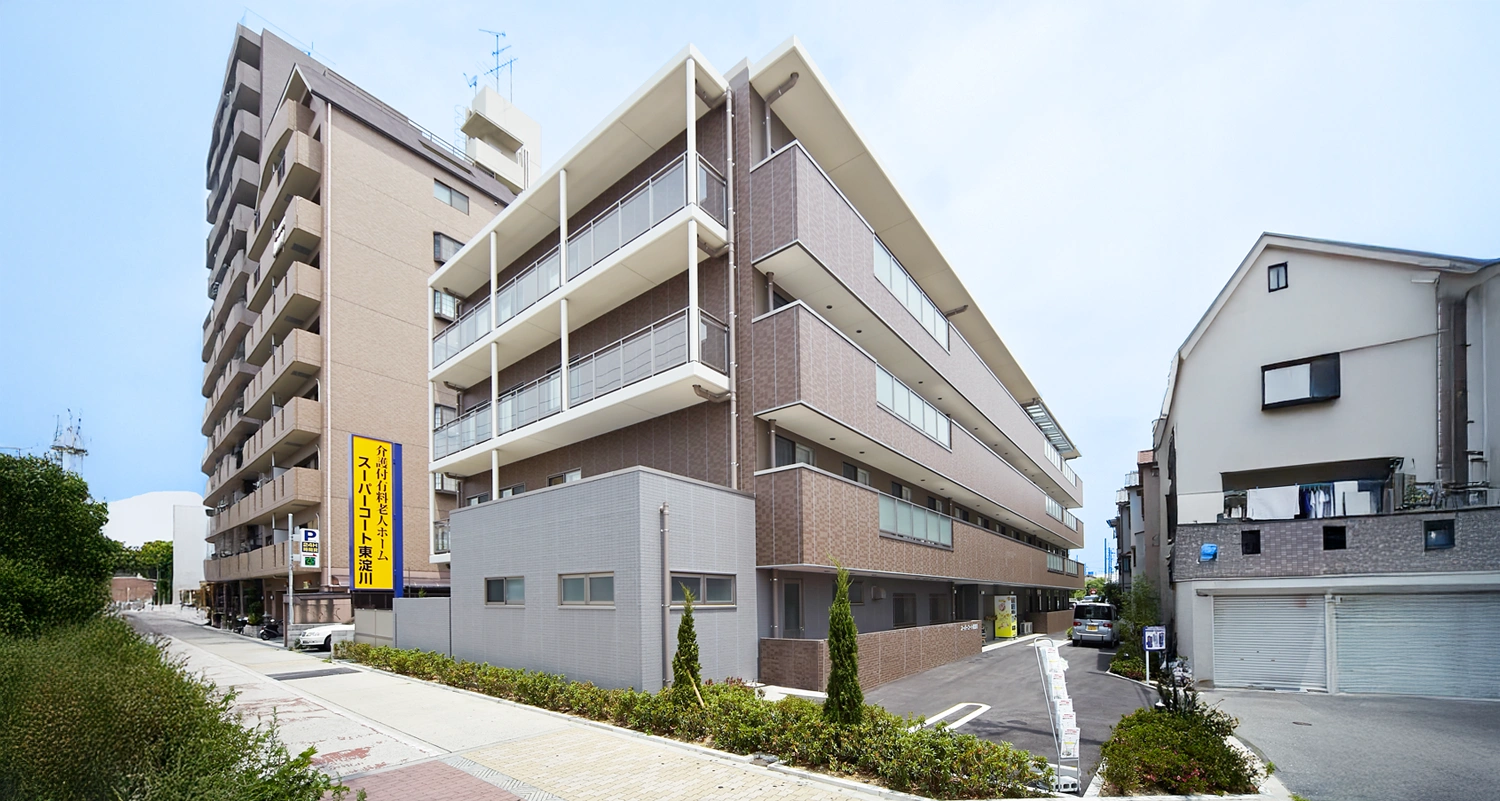東淀川区の有料老人ホーム「スーパー・コート 東淀川」は、パーキンソン病専門施設として医療・リハビリ環境が充実しております。大阪市営地下鉄今里線だいどう豊里駅から徒歩約6分にある淀川河川敷にも近く、周囲を3つの小学校に囲まれた閑静な住宅街に位置しております。