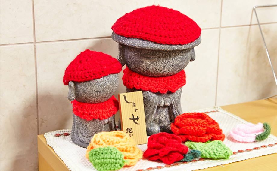 玄関先のスペースではお地蔵様がお出迎え。お地蔵様の帽子やお花などはご入居者様の手作りです。