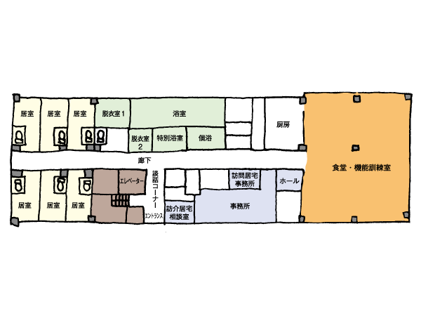 | 共用施設 | 食堂、浴室、共用トイレ、談話コーナー | 入居条件 | 要介護1~5、要支援1・2の方 |