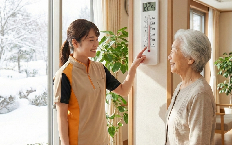 チェックポイント: 入居者様が厚着をせず、リラックスした表情で談笑されているか? 室内で寒さを気にせず、レクリエーションや交流を楽しめているか? 冬でも活動量を落とさず、規則正しい生活を送れる環境こそが、健康寿命の延伸につながります 。