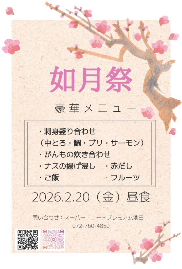 スーパー・コートプレミアム池田では、季節の移ろいを感じていただけるイベントとして「如月祭」を開催いたします。皆様に喜んでいただけるよう、料理長特製の豪華な昼食メニューをご用意いたしました。