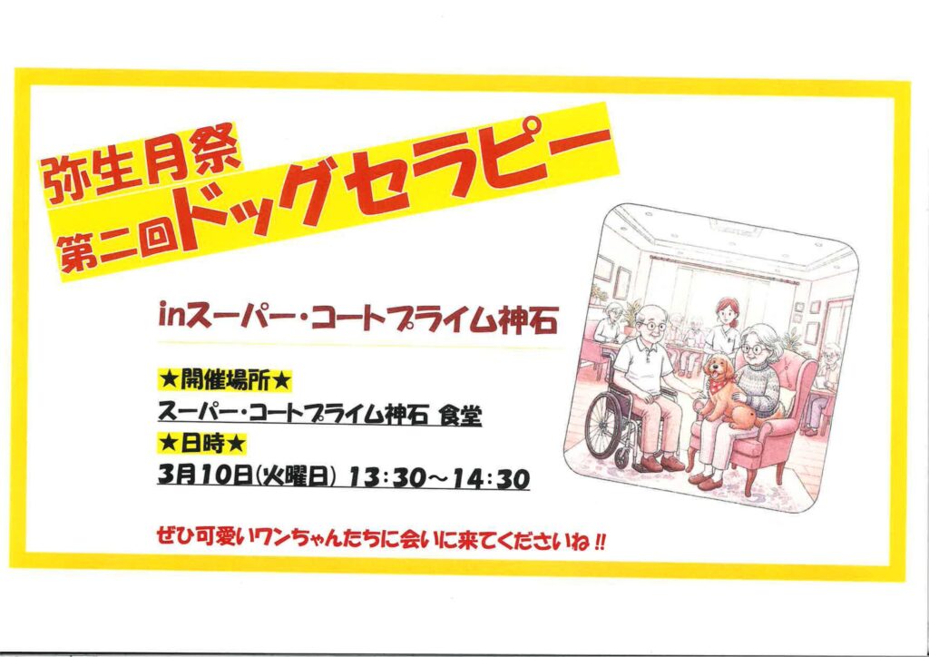 【スーパー・コートプライム神石】3月10日(火)「弥生月祭」第二回ドッグセラピー開催のお知らせ