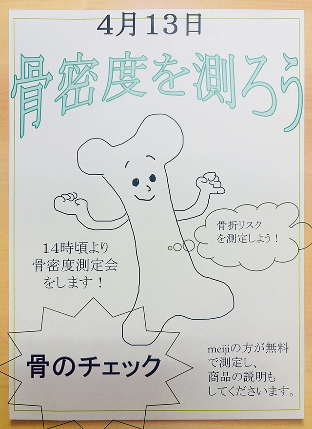 - 無料骨密度測定:専用の機器を使い、その場で骨折リスクなどの測定を行います。