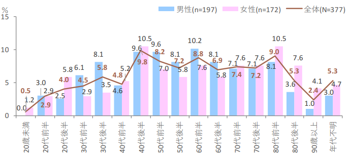 浦安市で2020年に行われた調査報告の中で公表された、年代・性別にわけた「セルフネグレクトが疑われる市民の属性」を見ると(※表1)、年代別では40代後半が9.8%で最も多く、次いで80代前半(9.0%)、60代前半(8.8%)の順で続いており、性別では男性の60代前半(10.2%)、女性の40代後半と80 代前半(いずれも10.5%)で1割を超えて多くなっていることがわかります。